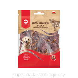 Maced Płuca wołowe to kawałki suszonego, pysznego mięska, które na pewno przypadną do gustu Twojemu pupilowi. Doskonałe uzupełnienie codziennej diety psa. Płuca są naturalnym źródłem protein, witamin, oraz innych składników odżywczych, które doskonale wpływają na prawidłowe funkcjonowanie organizmu. Zawierają mniejszą ilość tłuszczu od wieprzowych, dlatego bez obaw można podawać je pieskom z tendencją do nadwagi oraz szczeniętom.