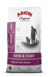 Arion Original Skin & Coat Adult Large to pełnowartościowa karma dla psów dorosłych ras dużych, ze świeżym łososiem. Jej bezglutenowa, monobiałkowa receptura, oparta na rybach zawiera unikatową mieszankę składników pochodzenia morskiego i cynk organiczny dla zdrowia skóry i sierści, oraz mieszankę chondroprotektorów dla wsparcia stawów.