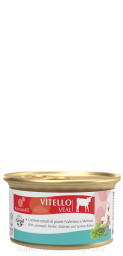 Skład: mięso i podroby (100% cielęcina), minerały, dekstroza, mąka łubinowa, olej słonecznikowy. DODATKI NA KG. Dodatki dietetyczne: 3a672a / witamina A 1220 j.m., 3a671/ witamina D3 150 j.m., 3a700 / witamina E 11 mg, 3c440/L-tryptofan wytwarzany w drodze fermentacji z E. coli KCCM 11132P 31,57 mg, tauryna 490 mg, 3b405 (miedź 1,2 mg ). Dodatki organoleptyczne: wyciąg z liści melisy lekarskiej 18,96 mg, wyciąg z korzenia kozłka lekarskiego 15,79 mg, nalewka z zingiber officinale 12,0 mg. Wilgotność: 81%.