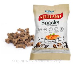 MEDITERRANEAN NATURAL Serrano Przekąski prosto z Hiszpanii to delikatnie, mięsne kawałki w kształcie kostki. Przysmak zawiera wszystkie niezbędne składniki odżywcze a jego niewielki rozmiar gwarantuje bezpieczeństwo Twojego pupila. Produkty SERRANO Snacks to wspaniałe urozmaicenie codziennej diety Twojego ulubieńca. Te smakowite i soczyste przekąski zawierają aż 70% świeżego mięsa (60% w "Serrano Przekąski dla szczeniąt").