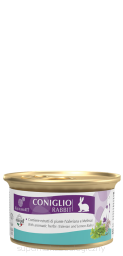 Skład: mięso i podroby (królik 100%), minerały, dekstroza, mąka łubinowa, olej słonecznikowy. DODATKI NA KG: Dodatki dietetyczne: 3a672a/witamina A 1220 j.m., 3a671/witamina D3 150 j.m., 3a700/witamina E 11 mg, 3c440/L-tryptofan wytwarzany w drodze fermentacji z E. coli KCCM 11132P 31,57 mg, tauryna 490 mg, 3b405 (Miedź 1,2 mg). Dodatki organoleptyczne: wyciąg z liści melisy lekarskiej 18,96 mg, wyciąg z korzenia kozłka lekarskiego 15,79 mg, nalewka z zingiber officinale 12,0 mg. Wilgotność: 81,0%.