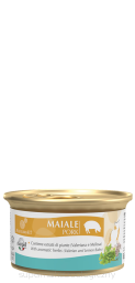 Skład: mięso i podroby (100% wieprzowiny), minerały, dekstroza, mąka łubinowa, olej słonecznikowy. DODATKI NA KG: Dodatki dietetyczne: 3a672a/witamina A 1220 j.m., 3a671/witamina D3 150 j.m., 3a700/witamina E 11 mg, 3c440/L-tryptofan wytwarzany w drodze fermentacji z E. coli KCCM 11132P 31,57 mg, tauryna 490 mg, 3b405 (Miedź 1,2 mg). Dodatki organoleptyczne: wyciąg z liści melisy lekarskiej 18,96 mg, wyciąg z korzenia kozłka lekarskiego 15,79 mg, nalewka z zingiber officinale 12,0 mg. Wilgotność: 81,0%.