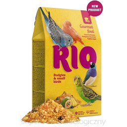 Karma uzupełniająca dla ptaków domowych. Karma Rio Gurmet dla papużek i małych ptaków jest bogata w całą gamę pysznych i pożywnych składników. Łatwo przyswajalne białka, zdrowe tłuszcze i kwasy tłuszczowe zawarte w całych jajach, suchych owadach i kiełżach (skorupiakach), pomagają utrzymać organizm ptaka w dobrej formie. Owoce i jagody (ananas, papaja, jarzębina i jagody jałowca), przyczyniają się do zróżnicowanej diety, a wyciąg z drożdży wzmacnia działanie obronne układu odpornościowego. Karma zawiera również dodatek pysznych i pachnących nasion kolendry.
